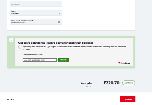 Once you add your Bahnbonus ID while booking a train, your extra Bahnbonus reward points will be added automatically to your account after the reporting period.