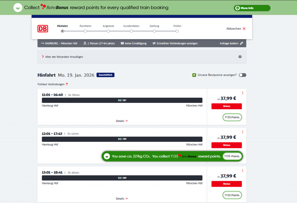 Example: On a route from Dortmund to Munich, you save 89 kg of CO₂. For a roundtrip, this grants you 890 Bahnbonus points. 1000 BBP will get you a free ride within Germany.