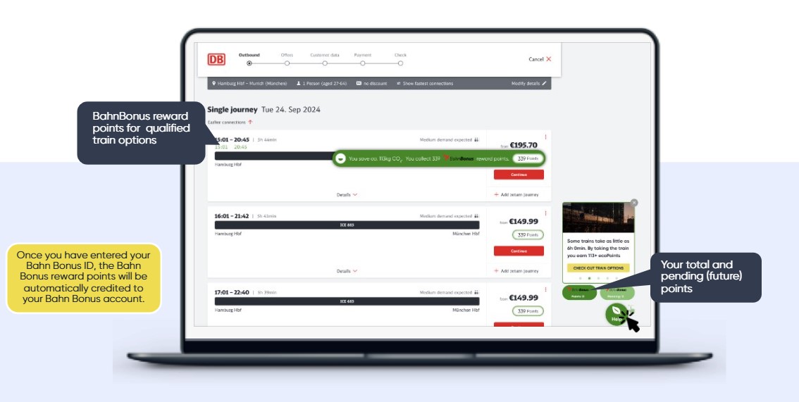 we will make it easy for you to understand your environmental impact and collect extra Bahnbonus Reward Points for each qualified train trip.